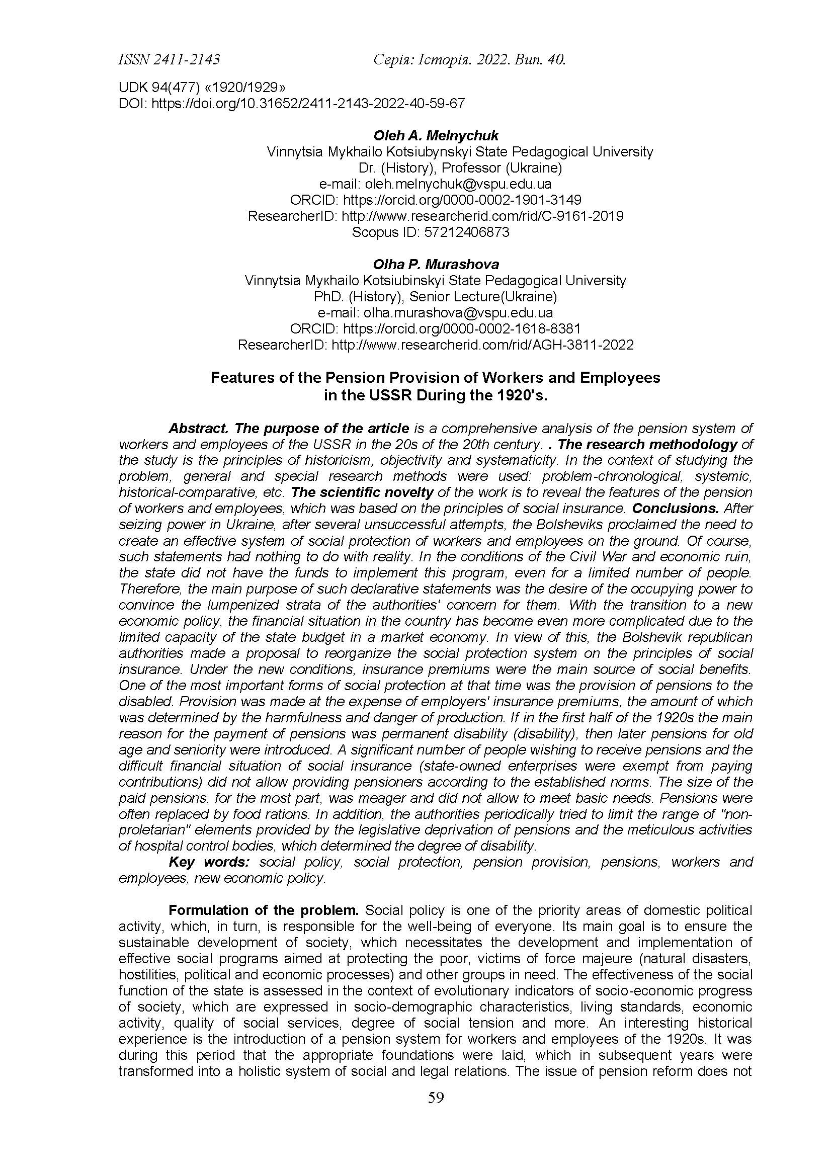 Meljnychuk, O.A., & Murashova, O.P. (2018). Rozvytok systemy derzhavnogho pensijnogho strakhuvannja v USRR. [Development of the state pension insurance system in the Ukrainian SSR].Ghileja, 42-45 [in Ukrainian]